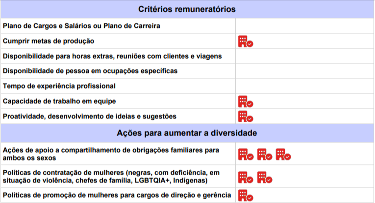Para cada grupo de ocupação que não apresenta cálculo da diferença, para salário de contratação ou para remuneração média, pode ter ocorrido um dos seis motivos:(1) por ter menos de três mulheres; (2) por ter menos de três homens; (3) por não ter mulheres; (4) por não ter homens; (5) por não ter três homens nem três mulheres naquele grupo ocupacional; (6) por não ter nem homens nem mulheres naquele grupo ocupacional.